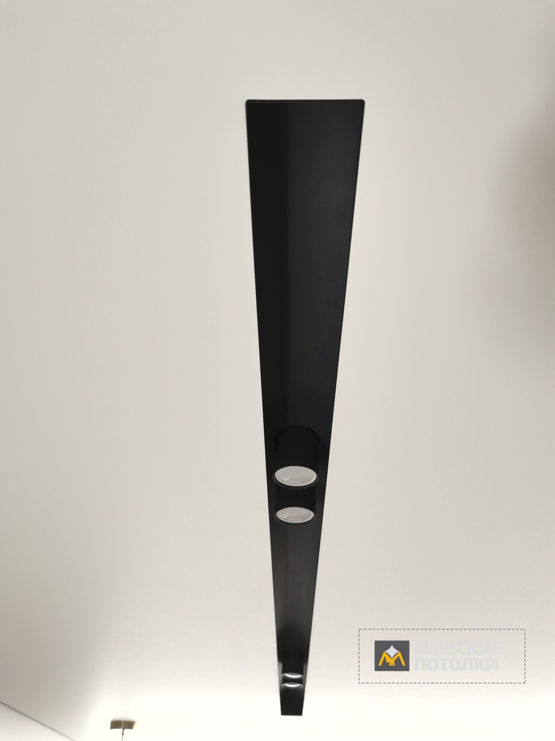 - Супер современно в интерьере натяжного потолка зрительно смотрятся нишевые углубления черного или белого цвета;